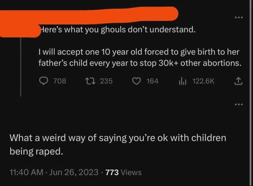 If I had to steelman their argument I’d wonder if they are properly informed about the very real, well documented physical risks to children from getting pregnant and carrying to term. Death is one option, but long term physical disability due to spinal and hip fractures aren’t unheard of. As well as a long list of other physical and psychological effects I’m not gonna put here.
