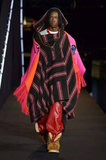 It looks like a pretty inventive cross between a Baja and a Poncho . It definitely uses Baja-like cloth, and it has a hood like a Baja. But it apparently has no sleeves, and is long like a poncho. And the hood looks more like a collar, which I think is rare for Bajas. And it has an additional blanket attached around the shoulders in a style which I kinda associate with north-american-Natives. It’s a great piece. Pairing it with moccasins is a visual pun. But I’m not crazy about the pants.