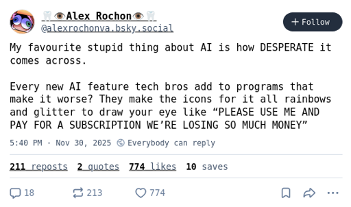 Using BetterStack for uptime monitoring… they made their UI basically unusable by shoving AI in your face at every turn. You would think that their first navigation entry would be the dashboard of monitors… NOPE, it’s their “AI SRE” “feature” which I didn’t ask for or need.